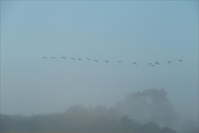 Früh am morgen, eine Schar Gänse ist im Anflug, es sind wieder mehr geworden die letzten Tage. nach der Vergrämungsaktion im Sommer waren sie zeitweise verschwunden, jetzt trudeln sie wieder ein.